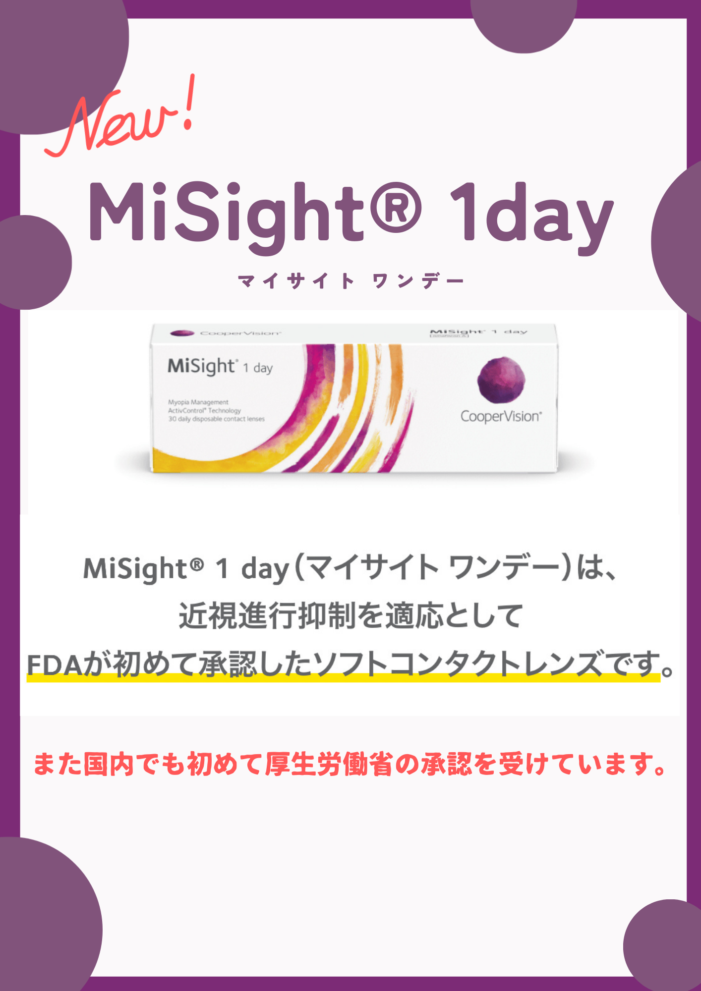 マイサイトは、FDA承認かつ日本で初めて近視抑制治療として承認された、小児の近視視力補正と近視進行抑制の両方を目的としたソフトコンタクトレンズです。